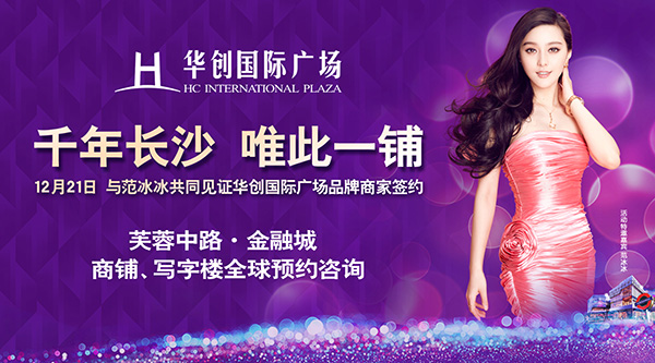 千年长沙,唯此一铺!12月21日,范冰冰与您相约华创国际广场,不见不散!长沙华创国际广场芙蓉中路• 临街商铺、国际甲级写字楼全球预约咨询。
